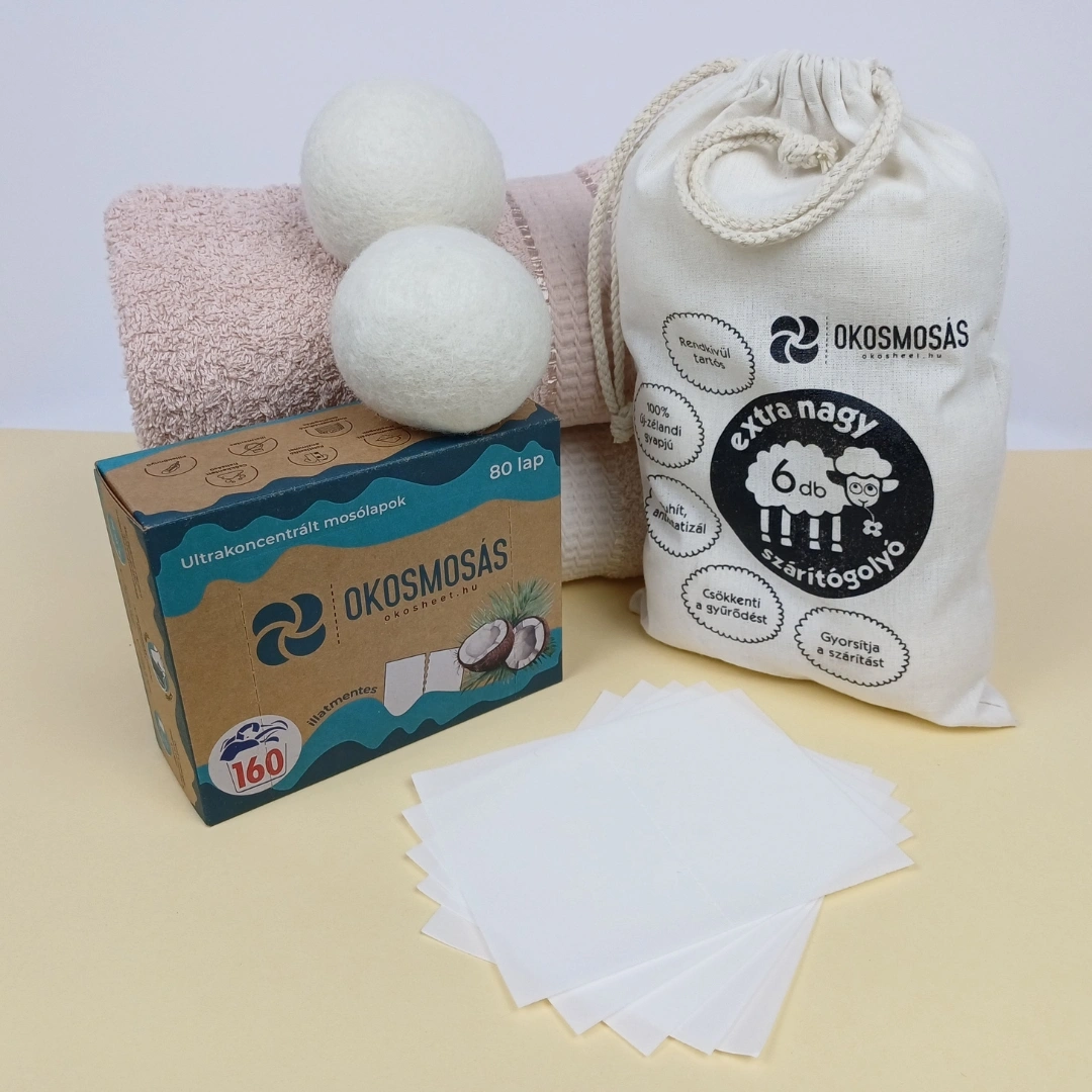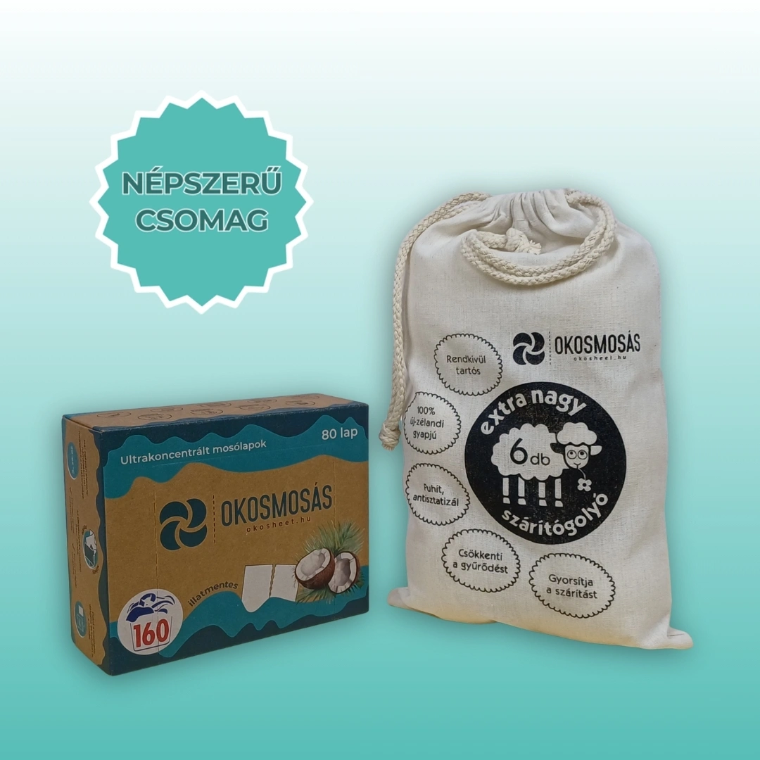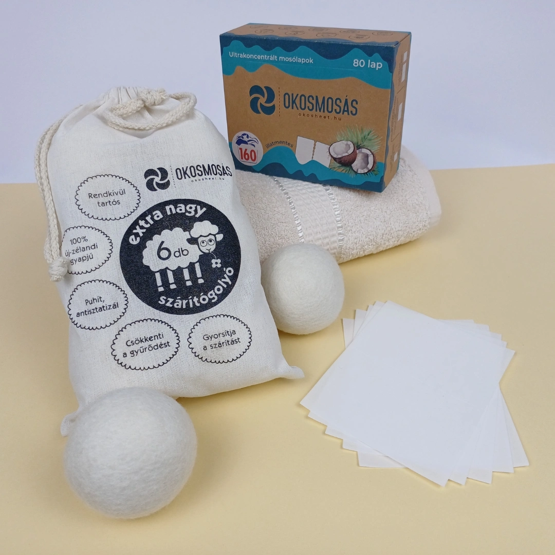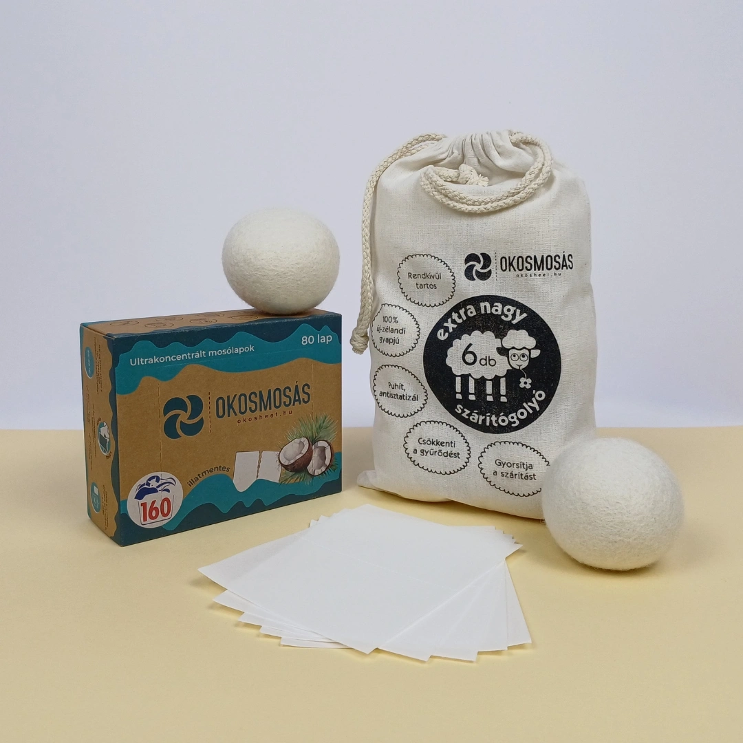 A csomag tartalma: 1 doboz mosólap + 1 zsák szárítógolyó