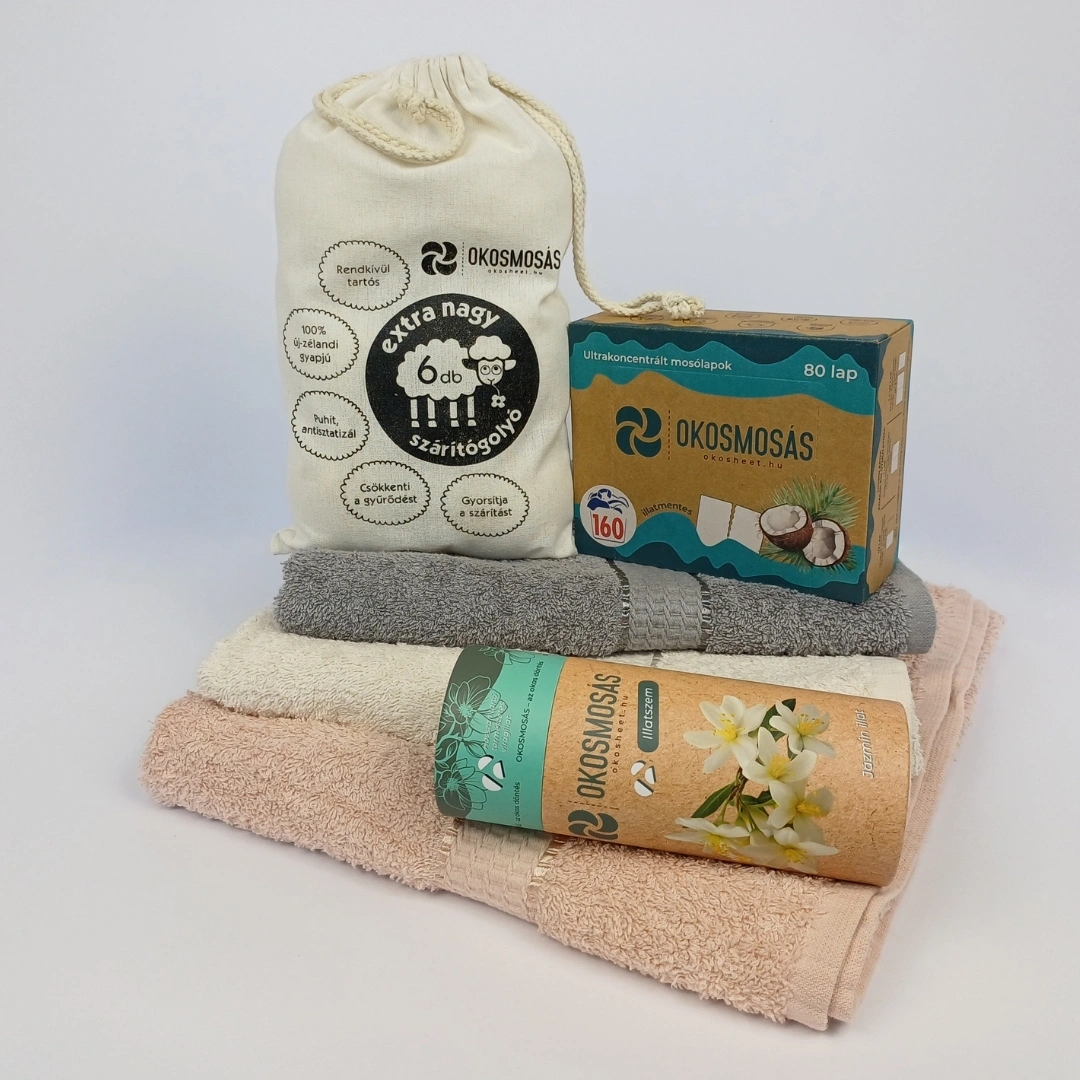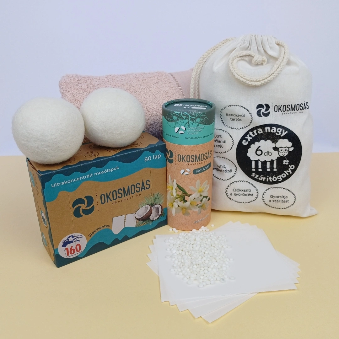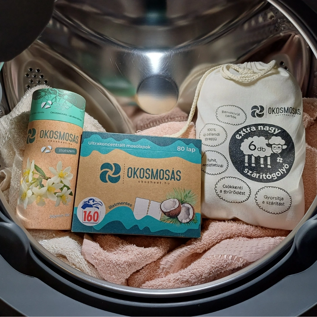A csomag tartalma: 1 doboz mosólap + 1 doboz illatszem + 1 zsák szárítógolyó