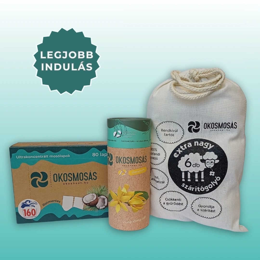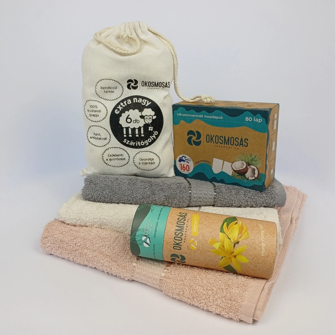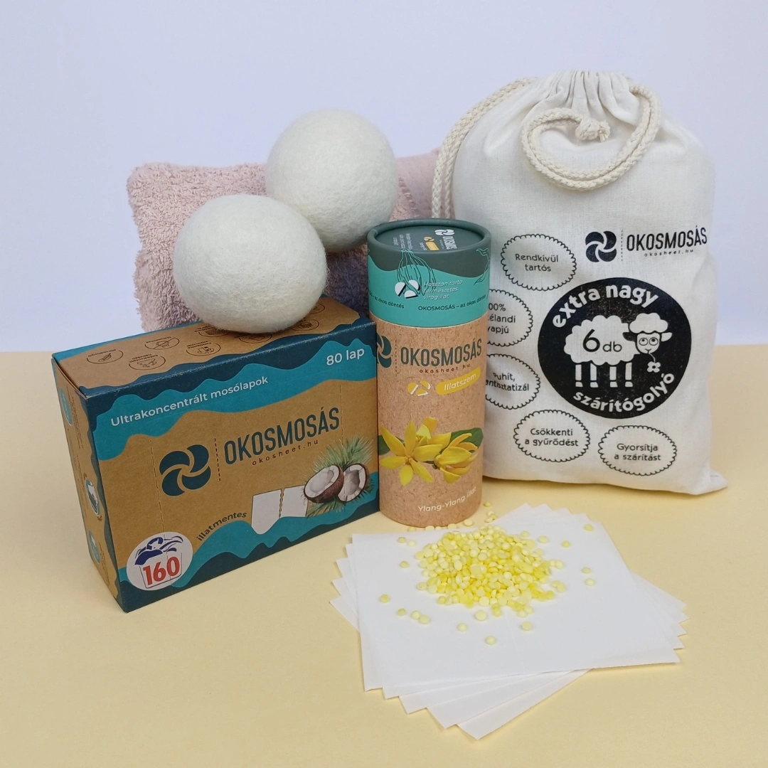 A csomag tartalma: 1 doboz mosólap + 1 doboz illatszem + 1 zsák szárítógolyó